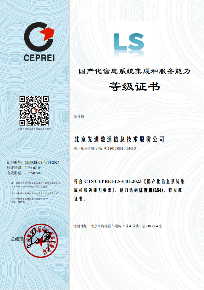 国产化信息系统集成和服务具有关乎国家科技开展和社会信息安全的特殊性,在行业准入方面具有特殊要求。截至现在,国产化信息系统集成和服务能力共划分为四个等级,从低到高依次为LS1级(初始级)、LS2级(基本级)、LS3级(良好级)、LS4级(优秀级)。认证过程经过严格的审核和评估,对企业综合能力、设计研发能力、集成能力、技术支持能力、管理能力等多项指标进行科学有效的考核评价。本次认证的顺利获得,不仅体现了业界对东升国际 东升研发能力、创新能力、企业管理能力等多方面认可,更彰显了企业的综合实力及核心竞争力已得到进一步提升。